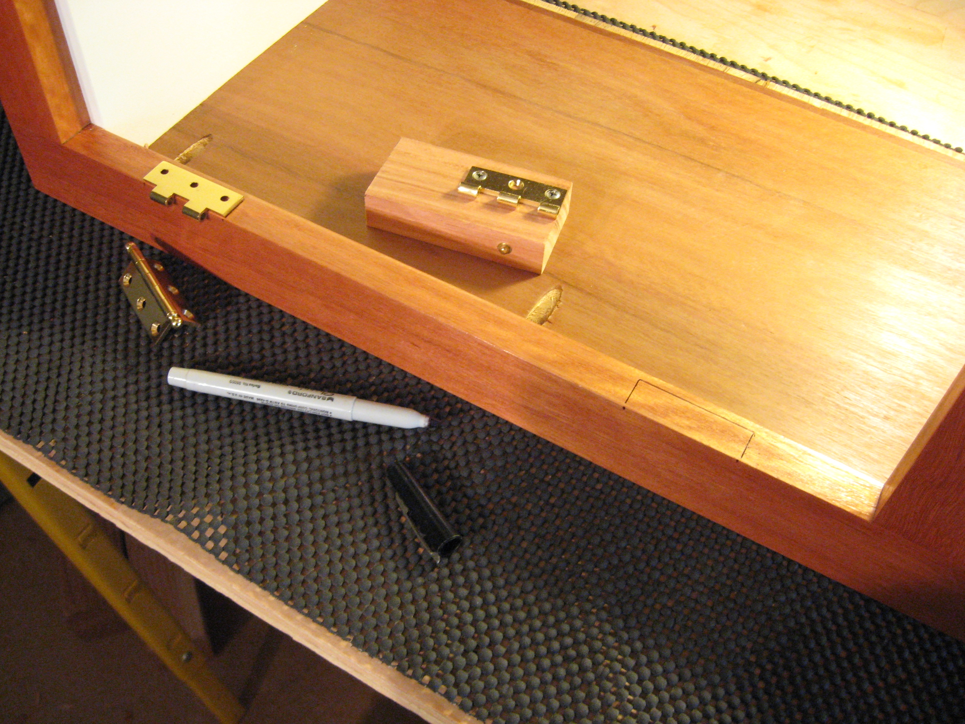 I start with markup shown in the first three pictures. Next I define cut limits well inside the markup in the next two pictures. Note that the cross grain cuts are done first. This will stop any runaway with the cut along the grain. The next two pictures show the chopping out process. The second to the last shows the mortise after I have cut the bottom flat to proper depth and trimmed it back to the total opening. The last picture shows the test fit prior to using a Vix bit to pre-drill the screw holes.