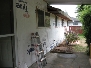 This house was built in 1953. It had no insulation in the walls. Cardboard was used between the shiplap sheathing and the cedar shingles. No wonder the paint would not stick. All of the cardboard was removed. Holes were drilled at the bottom of the window line and about 9" below the soffit in each void between studs. Using the Tiger Foam Insulation took a little practice to determine how much to use. I counted, one thousand one one thousand two... to figure the amount. It took several cavities to get it right. Tiger states R values from 5.9 to 6.2 per inch. Whatever it is, this house is going to approach a betterment of 20 times the original R value. The Tyvek will create the much needed wind and vapor barrier. The cedar siding will be back primed to help stabilize the hydrostatic pressure to keep the paint on. Inside I will paint with two coats of a vapor barrier primer under a coat of latex.