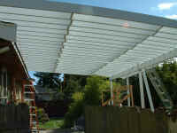 These pictures show raising and installing the 15 rafters. See the blue rubber sheet tied on the rafter on the second picture? I used this as a second set of hands throughout the construction effort.