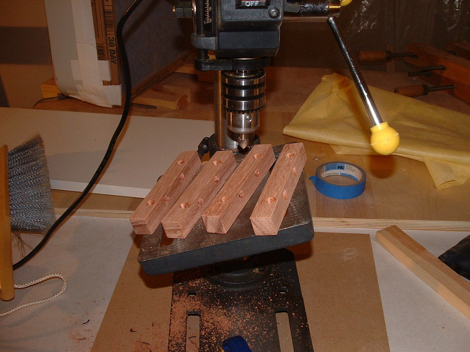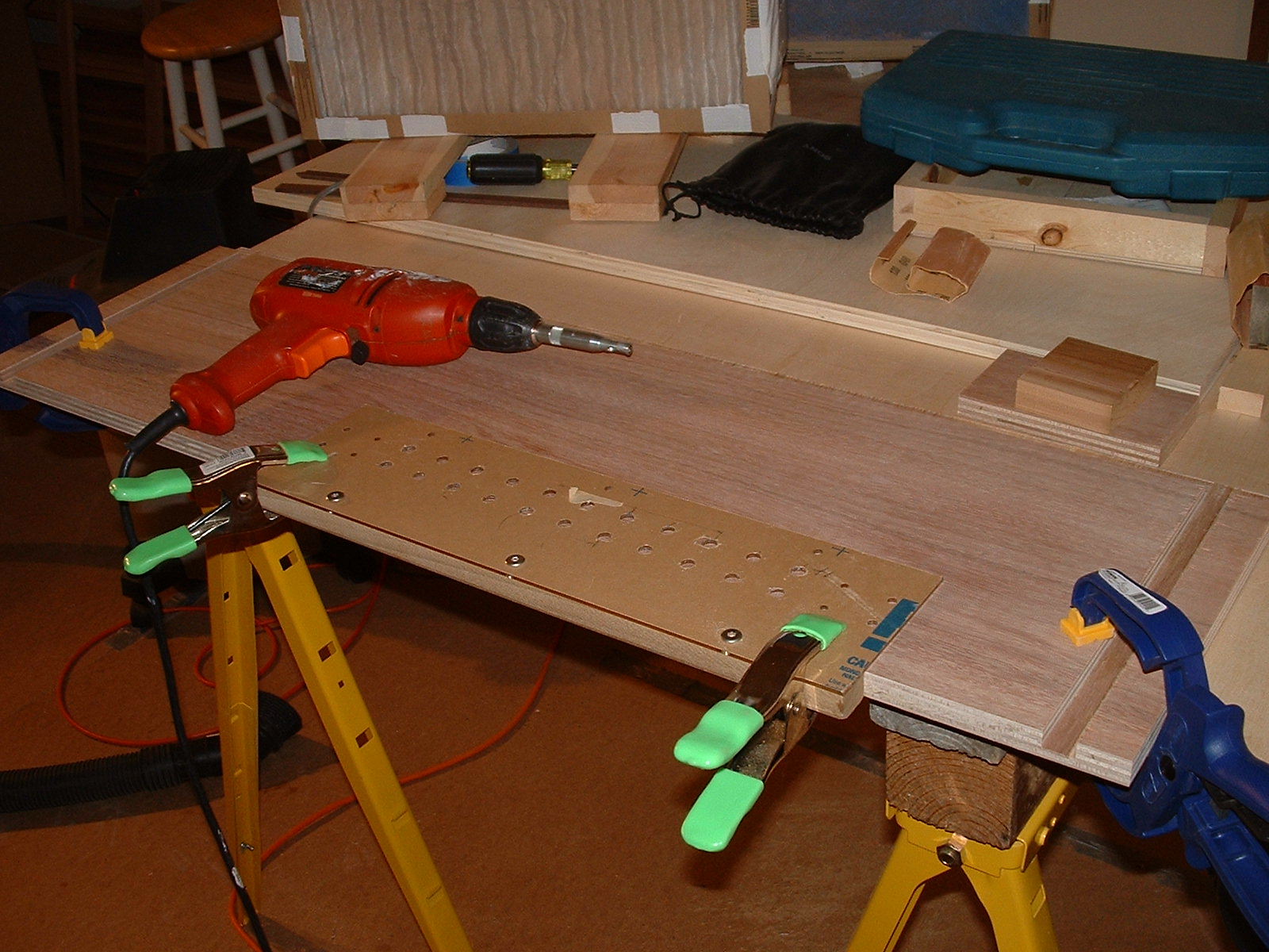 The two middle shelves in the cabinet will be adjustable. A jig is used to space and align the 1/4" holes along the front and rear of the side panels. These holes will accept the brass shelf pins used to support the shelves. The drill has a 1/4" Vix Bit in the chuck. This bit fits in the jig and centers the hole that is drilled.