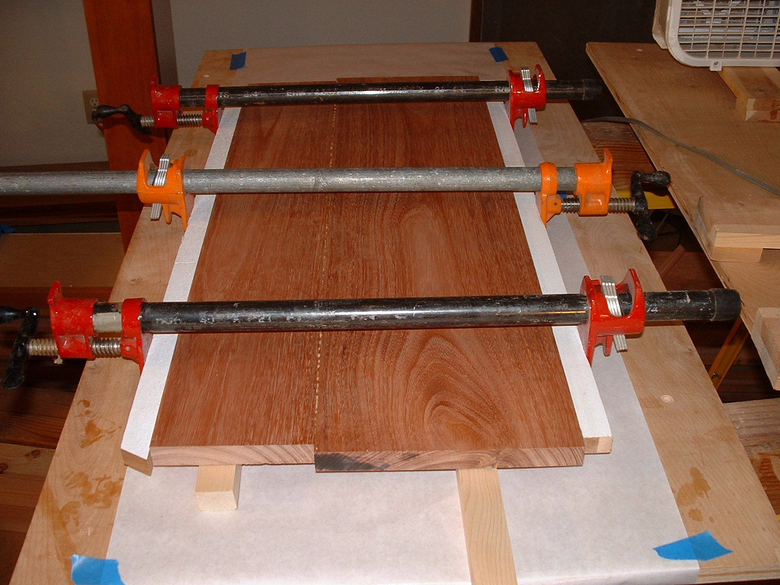 Glue Up of finished panels into un-finished stile and rails. After the glue-up dries I'll mask the panel and apply poly to the stiles and rails. If I apply the poly to all of the door after it is assembled a film will cover the moveable panel and it will no longer float. Therefore after the glue-up dries I'll mask the panel and apply poly to just the stiles and rails.