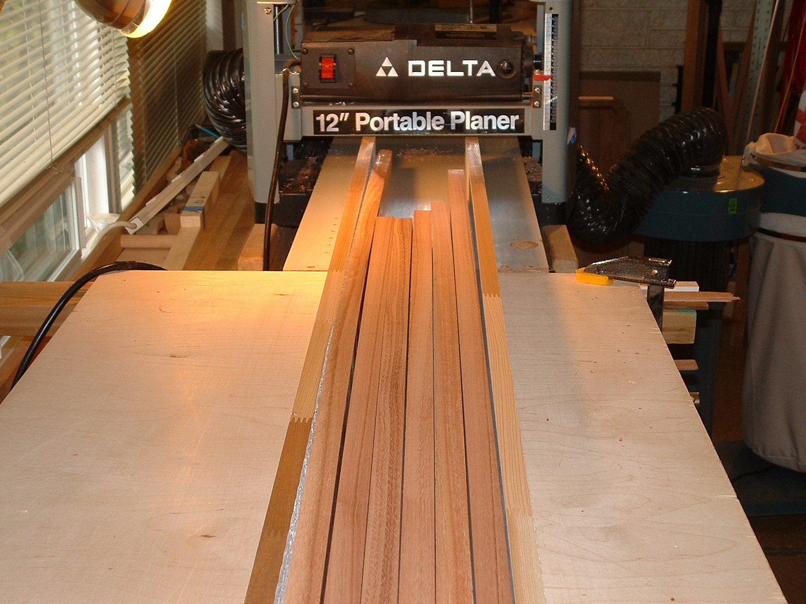 I ripped plain sawn 8/4 x 10" boards. This results in riff sawn and quarter sawn 2" wide clear straight grain boards for the door stiles and rails. These should be very dimensionally stable and resistant to warping. On the left is before and on the right is near the end of planing. I now must sand from 120 up to 600 grit. Fun!