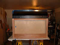 The first few coats are Zinsser SeatCoat Universal Sanding Sealer, a de-waxed shellac, to prepare the wood prior to the oil based polyurethane. See Technical Data Bulletin PDF file here: SealCoat. Between coats the surfaces are sanded with as high a grit as 600. Inside the melamine at the bottom and top are masked off. The shellac is applied with a rag. These large surfaces are difficult to finish. All the weight of the cabinet and its contents will hang on a few screws through the back of the cabinet into the wall. The 3/4" birch plywood back is cut to fit. The screws along the top and bottom are predrilled and countersunk. A dozen holes for the 4d nails along the sides are predrilled and Titebond glue is used.